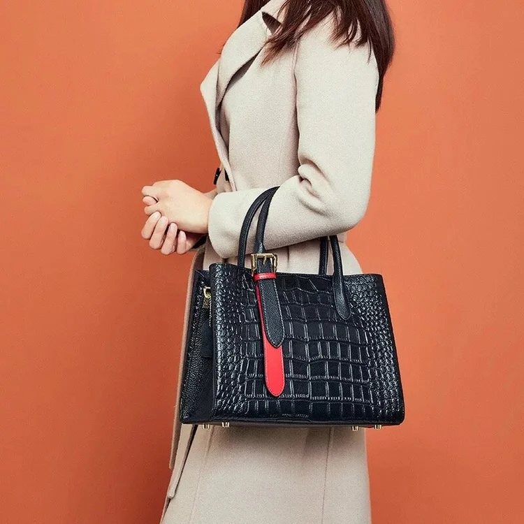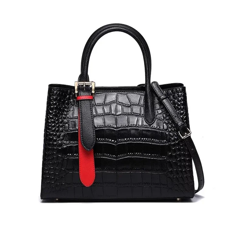 Elegant lady handbag in alligator pattern, black in color with a touch of red.